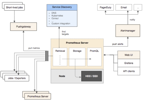프로메테우스는 데이터를 수치화하는 job, 직접 또는 push gateway를 이용하는 short-lived job에서 값을 전달받은 메트릭으로부터 데이터를 수집한다.