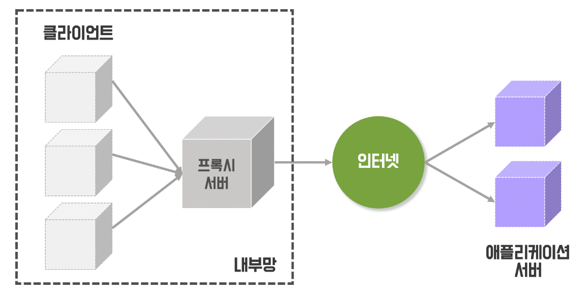 Client <-> Server 사이에 중계기로써 대리로 통신을 수행하는 역할을 하는 Server