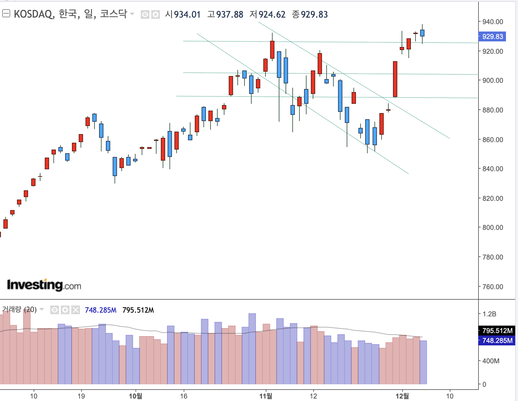 코스닥은 전고점 돌파를 앞두고 횡보를 하고 있다.