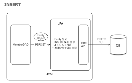 MemberDAO 객체를 저장할 때, JPA에 Member 객체를 넘기면 JPA는 Member Entity를 분석하여 Insert Query를 생성, JDBC API를 사용하여 SQL을 DB에 날린다.