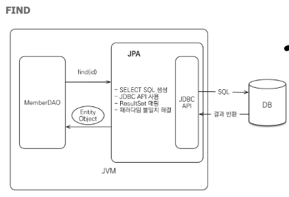 Member의 PK 값을 JPA에 넘기면, JPA는 Entity 매핑 정보를 바탕으로 Select Query를 생성, JDBC API를 사용하여 SQL을 DB에 날린다.