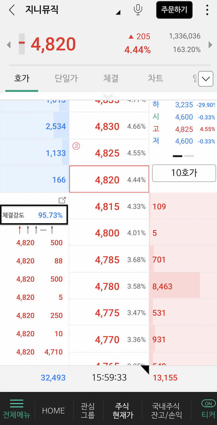 - 체결강도는 95,73% 지만, 좌측 하단을 보면 현재 호가 4,820의 매물이 빠르게 체결되고 있다.